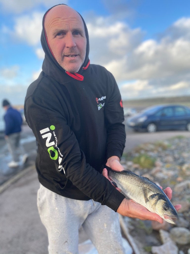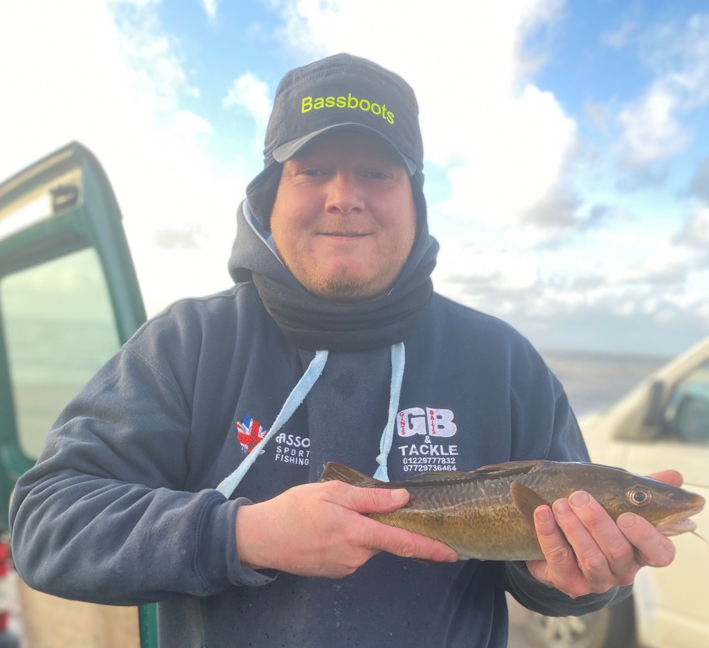Struggling to hold bottom in the big sea Kevin Rea moved further south about 300 metres from Paul Tuck, having starting fishing between the ruin of the ‘Old Pier’ and the more recently built Harrington Pier. He was quickly into a fish after moving, a codling of 1lbs 14oz. Just being pipped by half an ounce by Paul’s fish. These were the only fish Paul and Kevin managed , but a lot better than Mark Armstrong and Ray Mallinson who could not tempt a fish to take their baits.